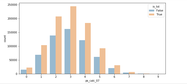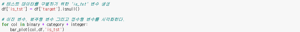 모든 변수에 대해서 위와 같이 파란색이 훈련데이터임에 따라 테스트 데이터가 1.5배 비율로 더 높고 비슷한 분포를 가진다는 것을 확인할수 있었습니다.