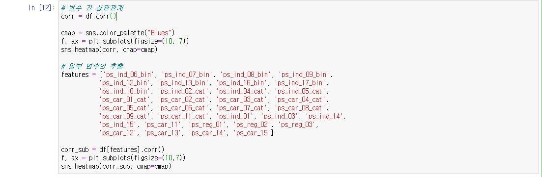 상관관계를 시각화 했지만 대부분의 변수들간의 상관관계가 낮았고, ps_ind_14와 ps_ind_12_bin 두 변수가 높은 상관관계를 가집니다.