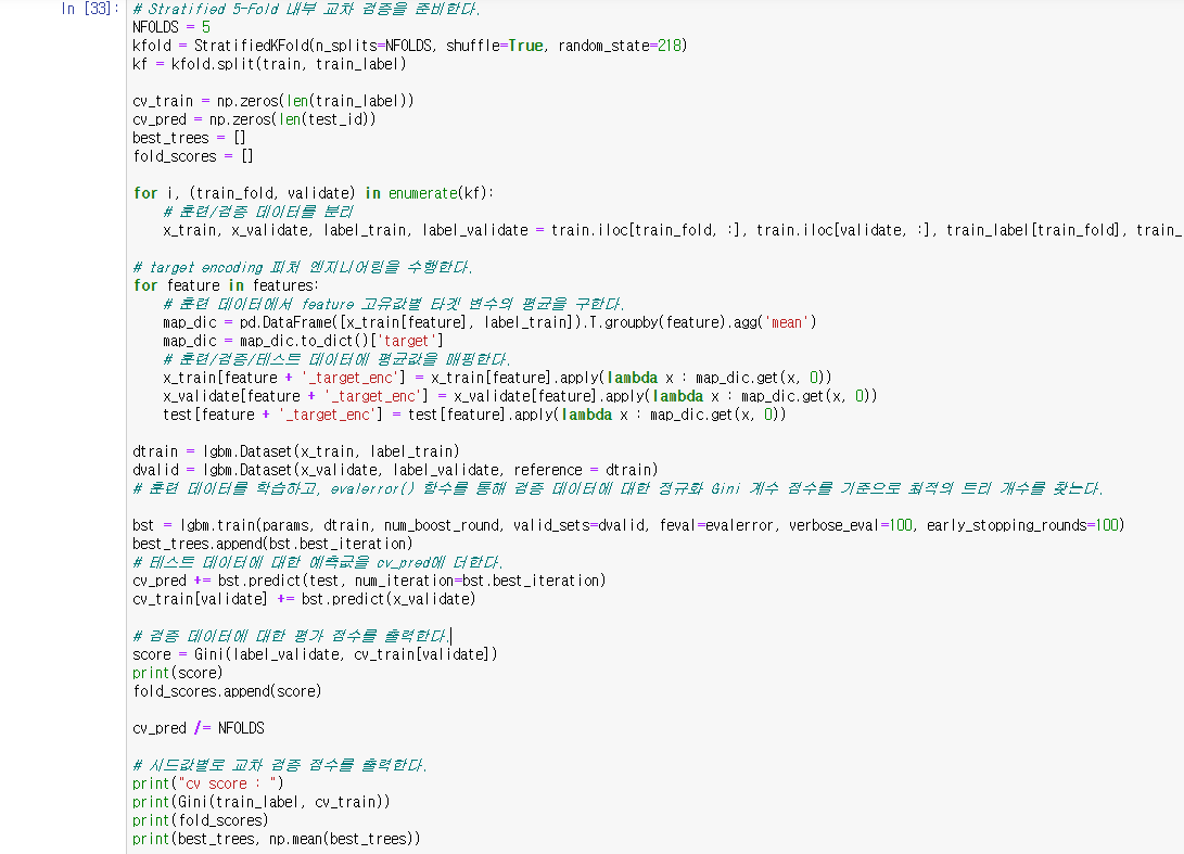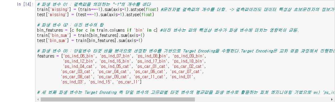 ex) 'ps_ind_01' 변수 값이 0일 경우, 'ps_ind_01 변수 값이 0인 모든 운전자들의 평균 타겟 값을 'ps_ind_01_target_enc'파생 변수로 사용.