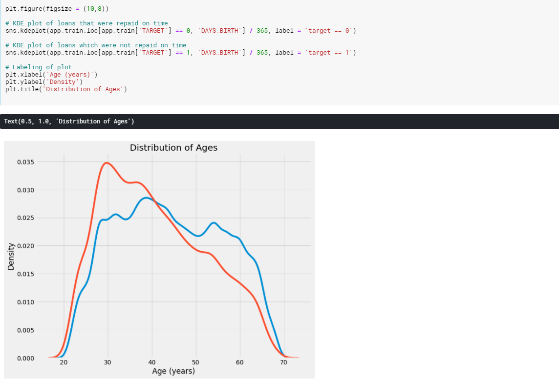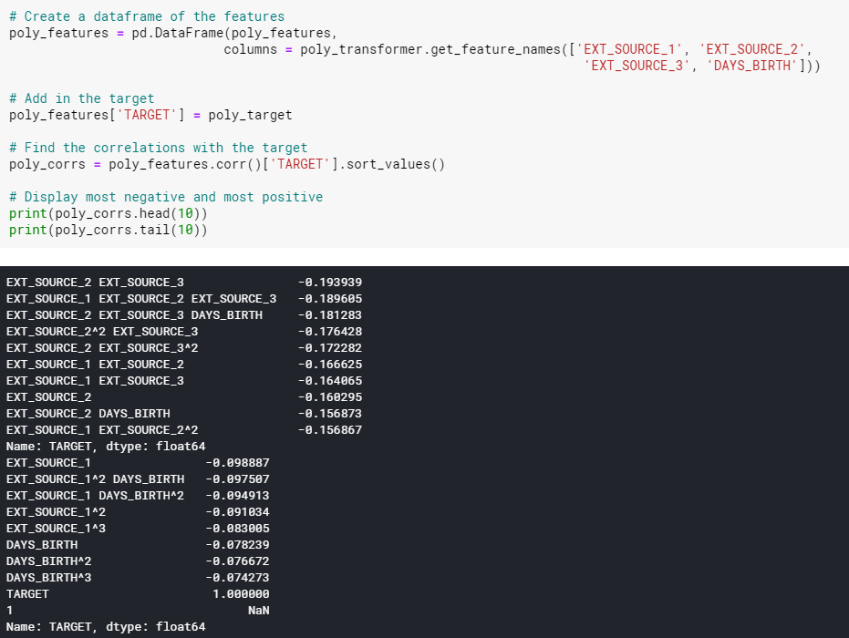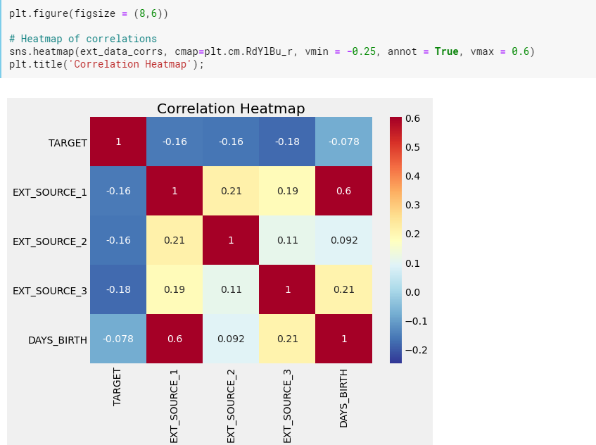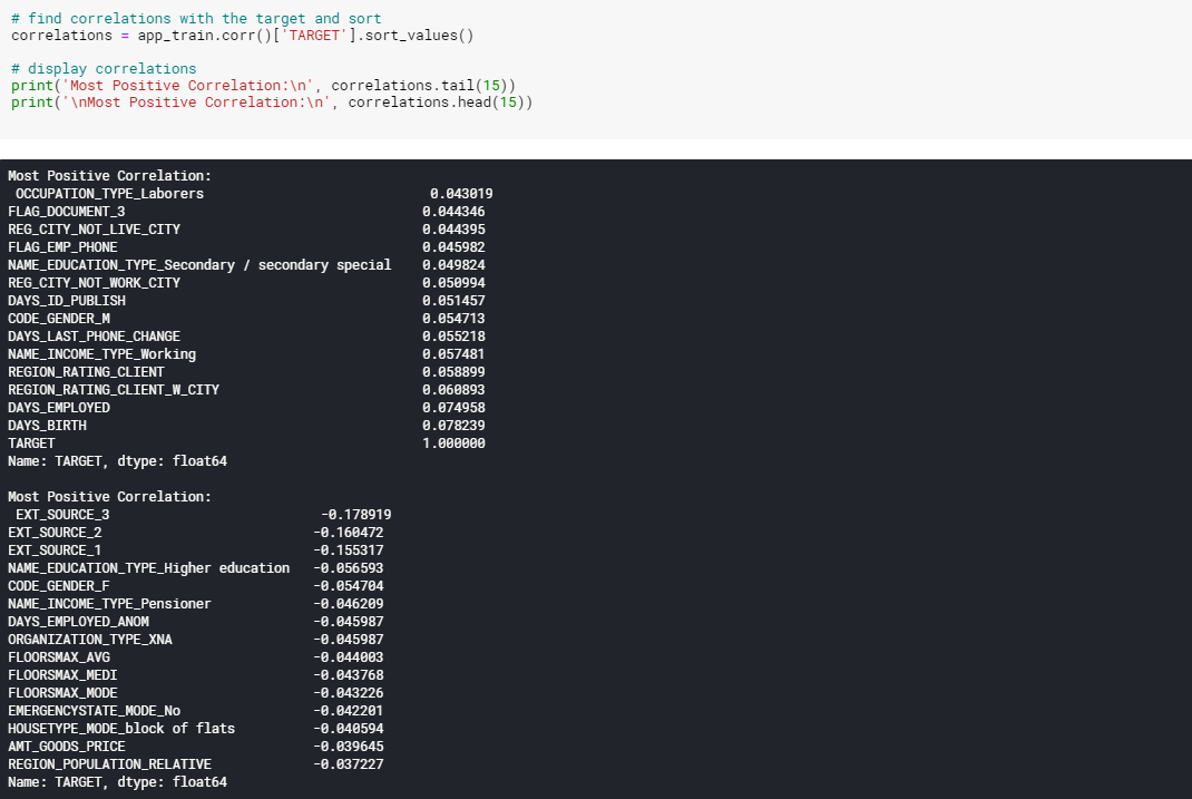 상관관계를 살펴보니 DAYS_BIRTH는 대출 시점의 고객 연령(일)입니다. 상관계수는 양수지만 이 값은 실제로는 음수이므로 나이가 들수록 대출에서 채무불이행(즉, target == 0)이 발생할 가능성이 적다는 것을 의미합니다.