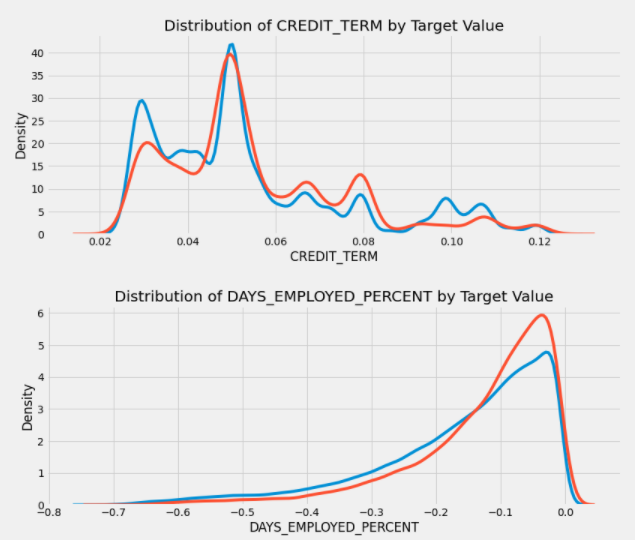 EXT_SOURCE_3은 대상 값 간의 가장 큰 차이가 드러난다. 이 특징을 보고 신청자가 대출금을 상환할 가능성과 어느 정도 관계가 있음을 알 수 있습니다.