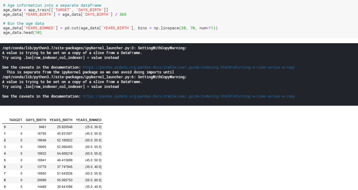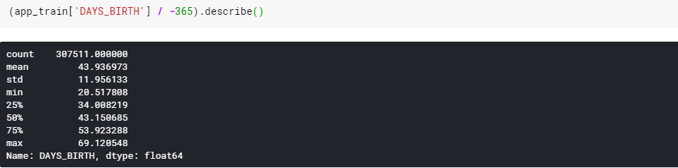 EDA를 수행할 때 주의해야 할 점은 data anomalies이다. 근데 이 데이터에서 DAYS_BIRTH column을 살펴보면 현재 대출 신청과 비교하여 기록되므로 음수이다. 그래서 연도별 통계를 보기위해 -1을 곱하고 일 수로 나누는 재작업이 필요합니다.