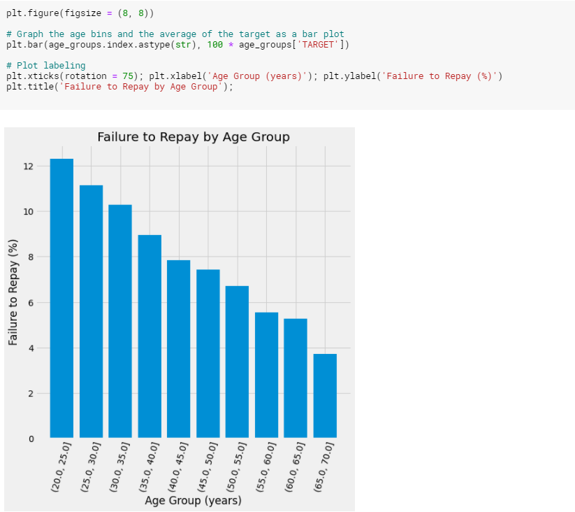 연령 범주를 5년씩 자르고, 각각의 평균값을 계산하여 각 연령 범주에서 상환되지 않은 대출의 비율을 알려줍니다.
